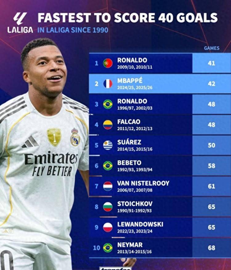 西甲40球速度之争:C罗41场称王,姆巴佩仅差一场紧追!